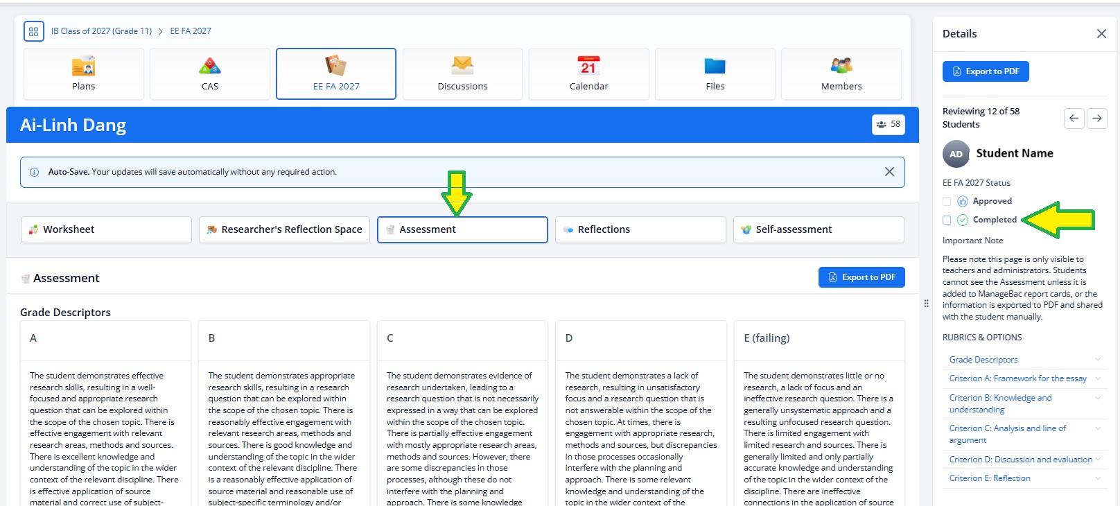 - Please use the Assessment page in Managebac to enter each grade for the Criteria (A-E).